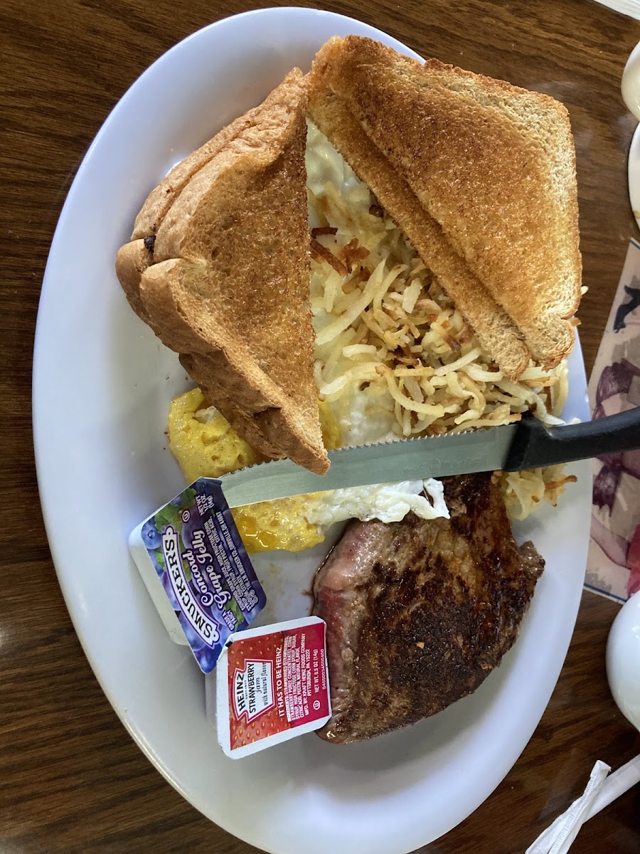 Absolute gem of a place. I have been in town for a week and have eaten here every morning. I have tried a lot. The steak and eggs are a great price and delicious. The home fries with gravy are stellar. The wait staff is amazing and so friendly. Chicken fried steak was probably my favorite. I don’t have enough good things to say about this place. Well worth a visit.